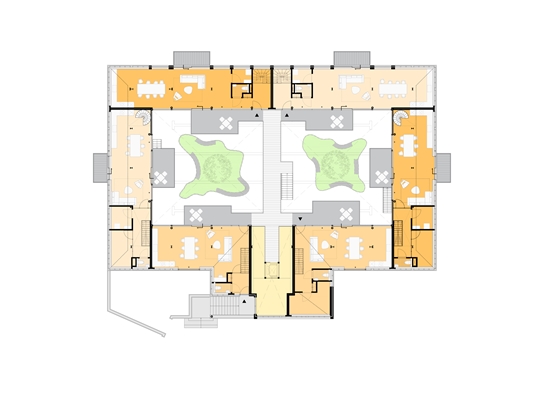 Wijzigingen in de gemetselde buitengevel beperkt Mei tot een minimum. Zo voegt het bureau slechts enkele uitzichtramen toe. Een nieuwe hoofdentree in de symmetrie van het gebouw maakt de woningen vanuit het hart toegankelijk.