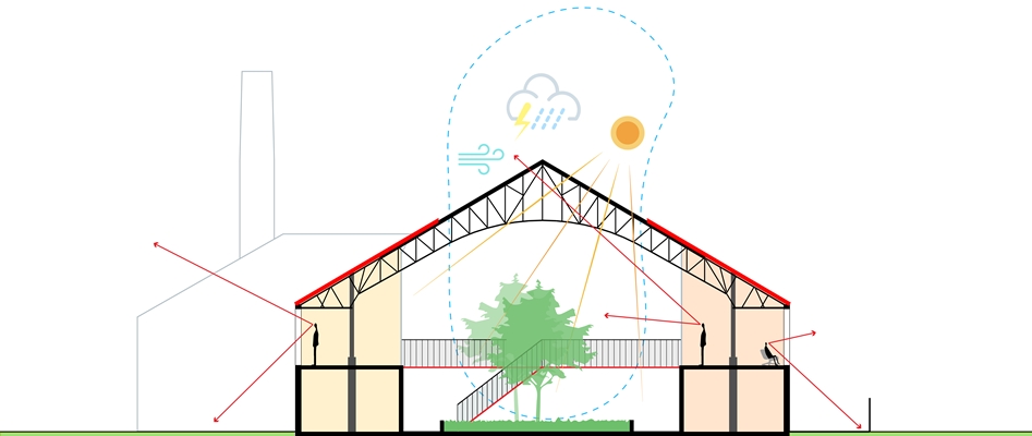 Om licht en lucht naar binnen te halen wordt het dak boven het zwembassin open gemaakt. De originele stalen dakconstructie komt daarbij in het zicht. De constructie loopt door in de woningen en blijft ook daar zichtbaar.