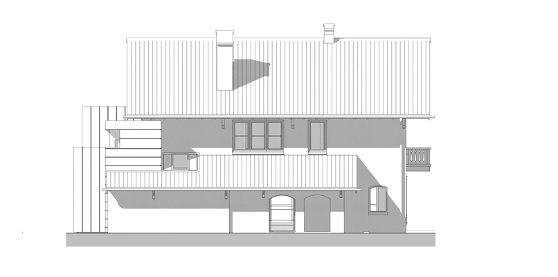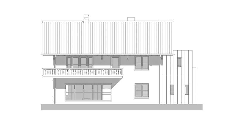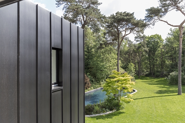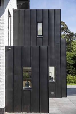 De schil van de uitbreiding is uitgevoerd in zwart zink en glas, wat een sterk contrast vormt met de bestaande chalet-achtige villa. Daarnaast is de kleurstelling van de bestaande villa aan gepast, waardoor het aanzien compleet is veranderd. Hiermee voldoet de renovatie aan de wens van de opdrachtgever om de woning eigentijdser en minder massaal te laten ogen.