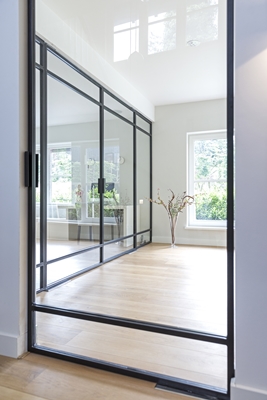 Het interieur diept de richting van het architectonisch concept verder uit, legt Kraal Architecten uit. Het bureau heeft met een samenhang van materialen, vormen en kleuren een eenheid tussen de verschillende leefruimtes bewerkstelligd. De rustige basis is gecombineerd met deuren met een zwart stalen profiel.