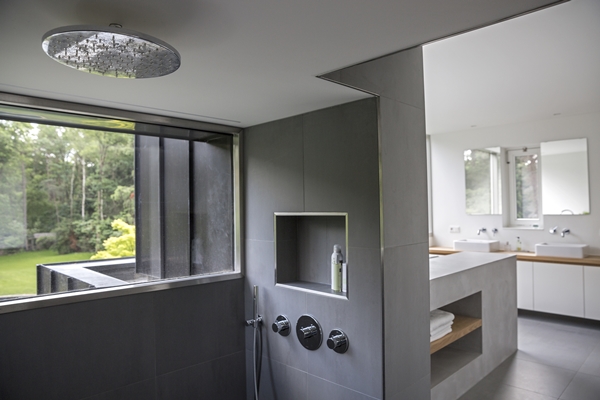 De badkamer op de eerste verdieping en ligt deels achter de pui van de keuken op de begane grond. Het ligbad biedt een panoramisch uitzicht op de tuin. De douche bevindt zich vlak onder het schuine dak en geeft uitzicht op zowel de achter- als de voortuin.