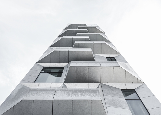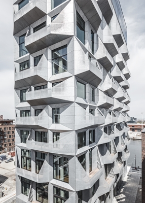 De oorspronkelijke betonnen façade van de silo is voorzien van een gefacetteerde huid bij wijze van klimatologische schil. Daarbij heeft het architectenbureau gekozen voor gegalvaniseerd staal. Het materiaal zal in de loop der jaren verweren en zo het rauwe karakter van de haven en het industriële verleden voelbaar maakt. De balkons doen mee in het regelmatige-onregelmatige spel van hoekige vormen.