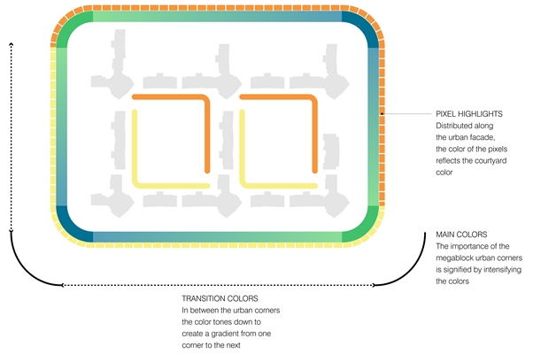 Dankzij deze opzet ontstaan volgens UNStudio bovendien ‘unieke’ appartementen, wat het gevoel van een eigen identiteit voor de bewoners moet versterken. De gevels van de binnenhoven zijn voorzien van warmere kleurtonen, zodat deze een intiemer karakter krijgen.