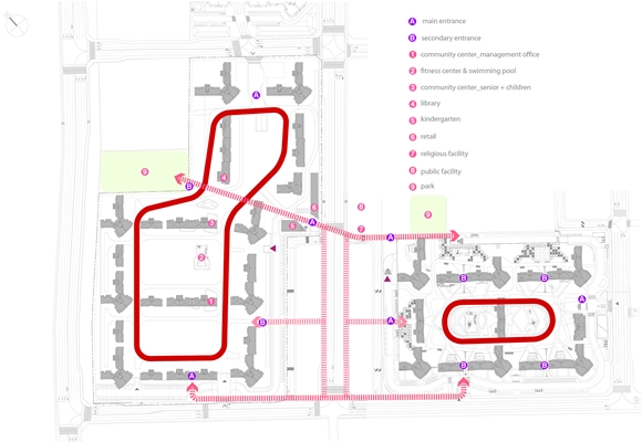 . Een belangrijk doel van het ontwerp is om een gezonde levensstijl te stimuleren. Het binnenterrein is als een flexibel ‘web’ van verschillende zones ontworpen, met veel groen en voorzieningen als een renbaan van vierhonderd meter en plekken om te ontspannen en ontmoeten.