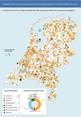 In de eerste helft van dit jaar is aan een recordaantal van ruim 4500 projecten voor duurzame energie subsidie toegekend. Met de toezeggingen is een bedrag gemoeid van ruim 5,8 miljard euro, meldt het