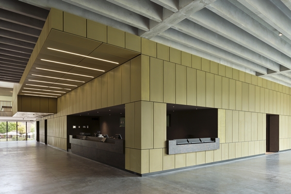 Het theatervolume is voorzien van messing ‘gevelbekleding’; de perforatie van de panelen draagt bij aan de akoestiek. De oude bakstenen muur van de villa is aangeheeld en gerenoveerd. Door de lichtstraat tussen het foyerplafond (uit prefab betonnen elementen) en de villa komt het voormalige woongebouw visueel los van de nieuwbouw.