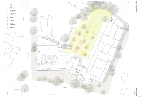 – destijds samen als denieuwegeneratie – voor om het nieuwe theatervolume in een hoek van het perceel, richting de Naarderstraat te plaatsen. Daarmee ontstaat tussen het theatergebouw en de oorspronkelijke villa ruimte voor een entreefoyer. De voorheen relatief gescheiden werelden van villa, beeldende kunst en podiumkunst worden nu een geheel door een centrale ontsluiting. KRFT en Oomen Ontwerpt hebben het project overigens in samenwerking afgerond, waarbij Sanne Oomen zich vooral op het interieur heeft gericht.