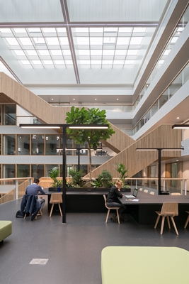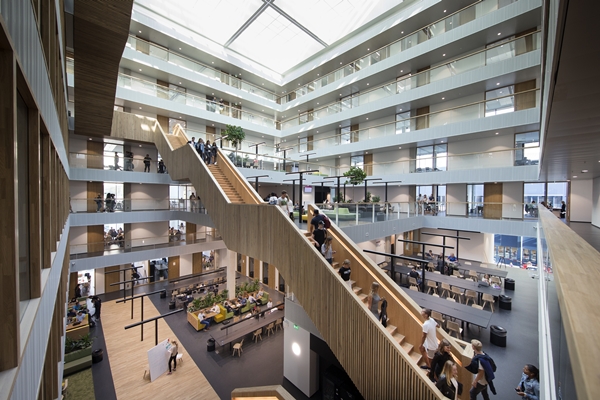 Meest in het oog springt de uit twee delen bestaande houten trap, die de gebruikers als een ‘rode loper’ van de begane grond naar de zes verdiepingen leidt. Bij gebouwen met atria wordt standaard geroepen dat de trap moet uitnodigen om hem te gebruiken, maar in dit specifieke atrium is het vanzelfsprekend dat je de trap neemt, zo prominent en natuurlijk voelt zijn aanwezigheid.