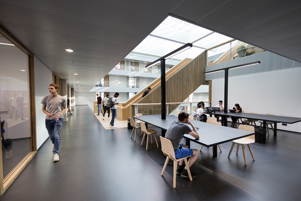 De architect heeft alle reden om trots te zijn, want het is een prettig gebouw geworden. Het atrium, dat aan drie zijden wordt omgeven door klaslokalen en aan een kant wordt begrensd door een glazen wand met vergader- en werkruimtes, stelt de gebruikers duidelijk op hun gemak. Op de tien ‘leerpleinen’, die als terrassen verspreid liggen door de ruimte, overleggen en werken studenten alsof ze er al jaren zitten, in plaats van pas twee weken. Een jongen doet zelfs een dutje op het zitmeubilair.