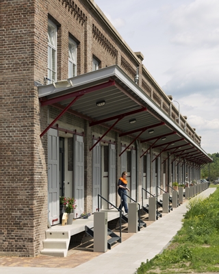 Het langwerpige volume is onderverdeeld in vijftien traveeën van 5,35 meter. Het architectenbureau heeft de woningscheidende wanden iets opzij geplaatst ten opzichte van de vakwerken, waardoor nu in elke woning een monumentaal gewelfjuk zichtbaar is.