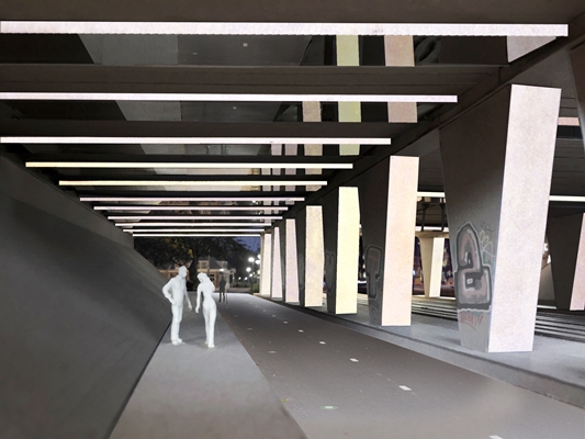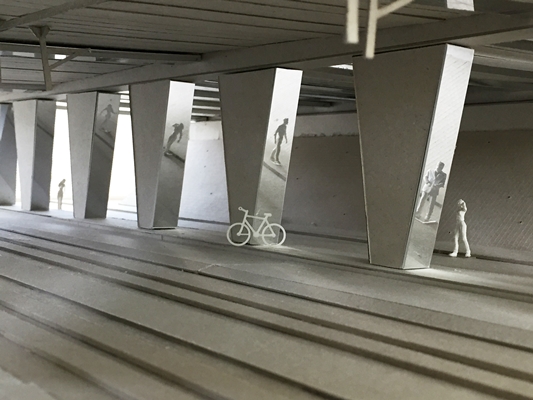 In het ontwerp wordt de bestaande architectuur van de tunnel benadrukt. Tegelijkertijd maken de spiegelende panelen op het plafond en de kolommen de ruimte lichter, ruimtelijker en opener. De gebruikte materialen zijn afkomstig uit de wereld van infrastructuur; spiegel en retroreflector, dat ’s avonds oplicht door het licht van fietsers, scooters en de tram.