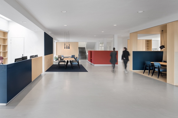 De verschillende elementen in de ruimte moesten een samenhangend landschap van werk- en ontmoetingsplekken worden. Met een subtiel kleurenspel van oppervlakken en materialen heeft het architectenbureau de verschillende onderdelen tot een geheel gemaakt.