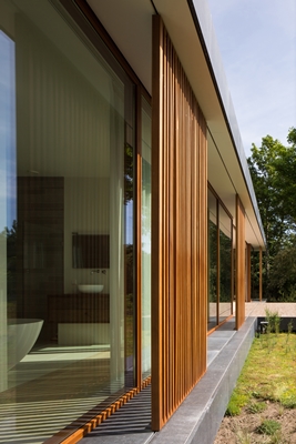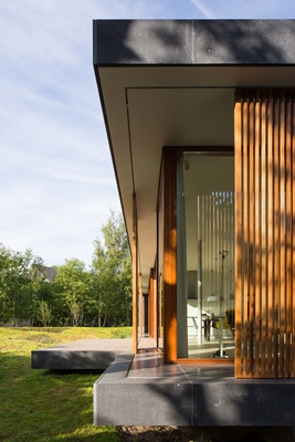 Extra aandacht hebben de architecten naar eigen zeggen besteed aan de compositie en dimensies van het terras, de woonkamer en de entree (die is ontworpen als een klassieke vestibule). De overstekken benadrukken het horizontale karakter en omkaderen de ruimte tussen plafond en vloer.