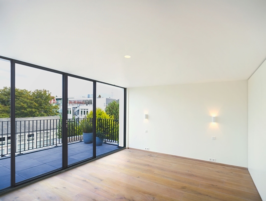 Het interieur biedt uitgestrekte ruimtes die baden in daglicht, leggen de architecten uit. De ruimtes kenmerken zich door heldere lijnen, op verzorgde wijze verwerkte bergruimtes en een rustig palet van wit- en grijstinten en natuurlijke materialen. De gekozen materialen en elementen zijn hoogwaardig en op maat gemaakt.