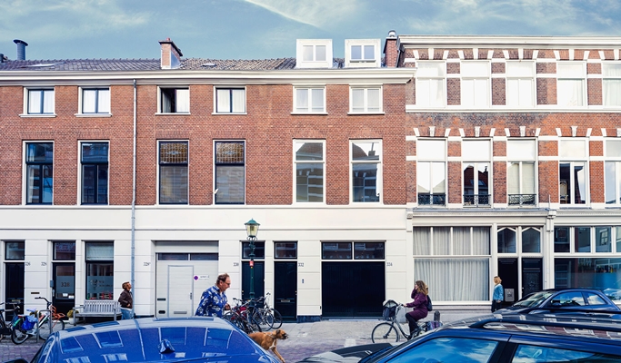 De gerenoveerde voorgevel van pand 332-334 met nieuwe zolderramen
