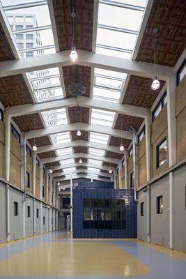 Karakteristiek onderdeel van de uit 1950 stammende oudbouw is de lange entreeruimte met robuuste betonnen portalen. Om het ruimtelijk effect te versterken, is de vloer tussen de begane grond en de eerste verdieping verwijderd. Zo ontstond bovendien een drie lagen tellend atrium.