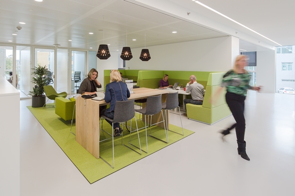 De vrij indeelbare kantoorbeuken bieden een gevarieerde werkomgeving. Op de begane grond liggen algemene functies als project-, vergader- en instructieruimten, de expeditie en technische ruimten. Op de verdiepingen liggen verschillende typen werkplekken, gegroepeerd tot zones van ‘rust, ruis en rumoer’. Een ‘brainstormlounge’ op de derde verdieping heeft een aansluitende buitenruimte.