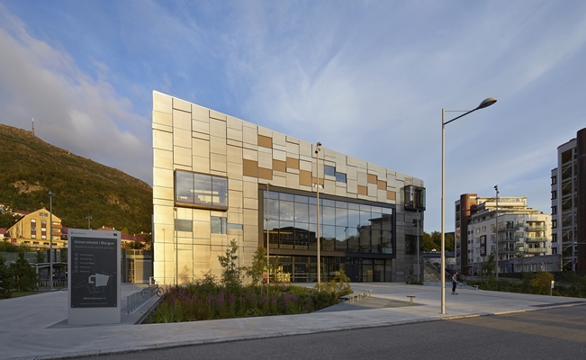 De universiteit van Bergen, Noorwegen heeft haar nieuwe gebouw voor de faculteit Beeldende Kunst, Muziek en Design geopend. De openheid die de universiteit nastreeft komt in het ontwerp van architectenbureau
