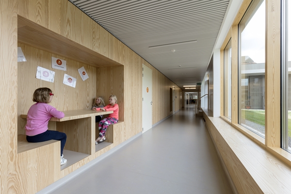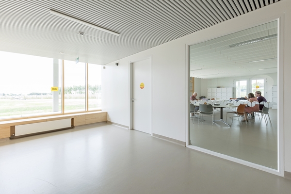 In de dikke āwandenā van de hal zijn kleedruimtes en opslagruimtes opgenomen, maar ook uitgespaarde ruimtes voor spelen en leren. Op deze manier heeft NL Architects een actiever en gevarieerder gebruik van de omliggende verkeerszone stimuleren en meer plakken voor (afgezonderd) leren aanbieden.