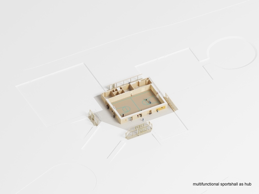 Door de sporthal centraal te situeren, kan deze fungeren als het verbindende plein: de plek voor bijeenkomsten, theater, feestelijkheden, en dergelijke. De hal is ook knooppunt: rondom loopt een gang, die de clusters verbindt.