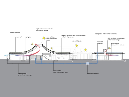 De opdrachtgevers hadden de wens dat het nieuwe scholencomplex zou voldoen aan de eisen van Passief Bouwen. Het energieverbruik voor verwarming en koeling mag bijvoorbeeld niet boven de 15 kWh/m2 komen. Om het doel te bereiken heeft NL Architects een aantal ā technische en architectonische ā maatregelen genomen.