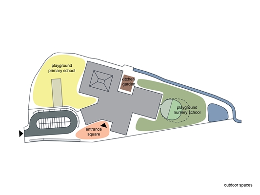 De ruime kavel heeft het mogelijk gemaakt om de hele campus in een enkele laag te organiseren. Bovendien hebben alle lokalen daardoor direct toegang tot de buitenruimte. Tussen de clusters liggen afzonderlijke buitenruimtes met verschillende functies, zoals eigen speelplaatsen voor de basis- en voor de kleuterschool.