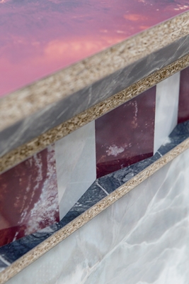 Voor Transitions III verrast Van Uden met Abet Laminati digiprint en een spaanplaatconstructie. Google Earth-beelden van ongerepte landschappen ogen hoog van boven als chic natuursteen, zoals ook de vormentaal naar het gebruik van marmer verwijst. Het contrast tussen het ruwe spaanplaat en de HPL toplaag is enorm.