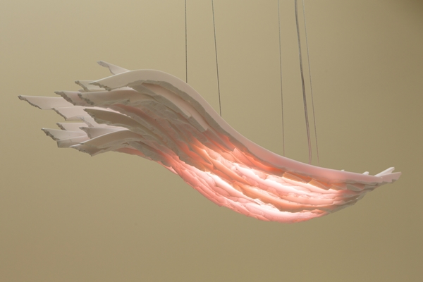 Ook Floris Wubben presenteert een collectie van verlichtingsobjecten. In zijn onderzoek naar de esthetiek van gebroken objecten kwam hij verrassend genoeg uit bij het solid surface-materiaal HI-MACS. Door het materiaal te verwarmen met een zelf ontwikkeld gereedschap kan hij het laten scheuren.
