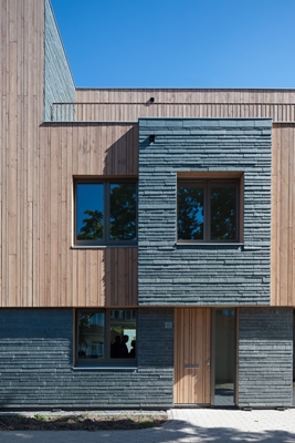 Niet alleen zorgen de groen getinte leisteen (Vega Verde) en het hout (lariks) voor verschillen in textuur, ook hebben de architecten ze op gelaagde en variërend in richting toegepast. Dit wekt bijvoorbeeld de suggestie dat uit een groter volume delen van de stenen schil zijn weggezaagd, waardoor het inwendige warme hout zichtbaar werd.