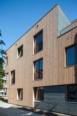 De woningen van de drie blokken sluiten alle zo goed mogelijk aan op de grote, weelderige gemeenschappelijke binnentuin. Elke plek is daarbij uniek, volgens de architecten, en de afzonderlijke woningen zijn herkenbaar door de verschillen in volume. Door een helder beeld met twee natuurlijke gevelmaterialen – leisteen en hout – en een eenduidige detaillering blijft Groene Mient een geheel.
