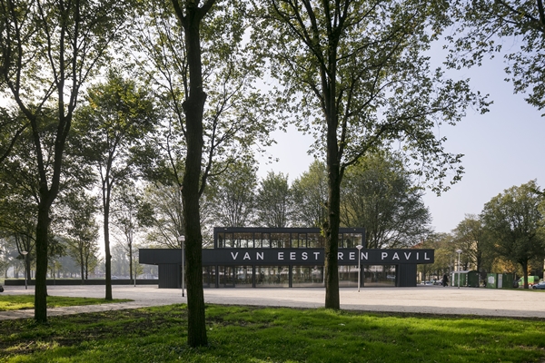 Korteknie Stuhlmacher Architecten hebben, geïnspireerd door paviljoenbouw uit de jaren vijftig en zestig van de vorige eeuw, een sober houten gebouw met veel glas ontworpen. De constructie van het Van Eesteren Paviljoen is eenvoudig en duidelijk leesbaar, waarmee het aansluit bij het karakter van de architectuur in de omgeving. Door zijn donkere kleur maakt het op vanzelfsprekende wijze deel uit van de parkachtige omgeving.
