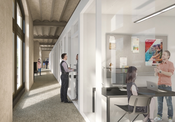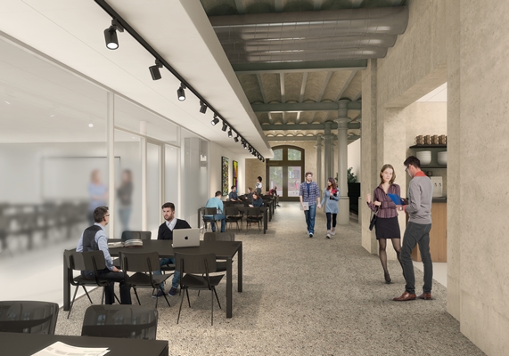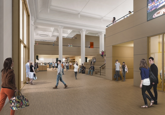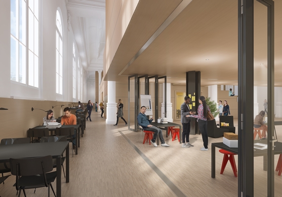 Binnen verdwijnt de stalen constructie die in de jaren ’80 is toegevoegd om tussenvloeren te maken. Hierdoor wordt het gebouw opener, kan meer daglicht toetreden en worden de originele ornamenten beter zichtbaar. De monumentale gevels blijven intact doordat onderwijs- en kantoorruimten als gestapelde dozen los van de gevels worden geplaatst.