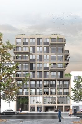 Door te bouwen in hout kon op deze plek een zeer duurzaam woongebouw ontstaan, dat ook nog eens zeer transparant zou zijn en grote balkons zou hebben. Als je de CO2-voetafdruk van een regulier gebouw in de tijd vergelijkt met die van een houten gebouw, dan komt die laatste er significant voordeliger uit. Vanuit dat perspectief bekeken mag de draagconstructie ook best wat dikker zijn, benadrukt Vola, want hoe meer hout je toepast, hoe lager je CO2-voetafdruk wordt.