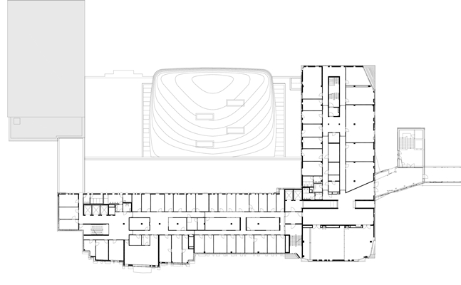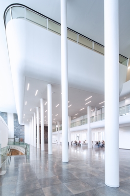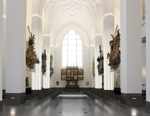 Daartoe is de ruimte met twee schuifdeuren van 15,5 meter hoog – de hoogste transparante schuifdeuren ter wereld, aldus het architectenbureau – in twee delen te splitsen. De aula is voor de seculiere evenementen; de ‘Andachtsraum’ is bedoeld voor contemplatie. Het auditorium beschikt verder onder meer over twee orgels.