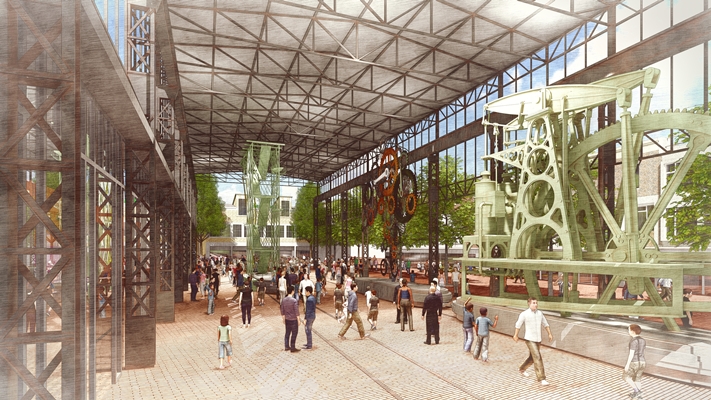 Deze karakteristieke hallen van de bekende machinefabrikant, die zich in 1868 in Hengelo vestigde en van groot belang voor de ontwikkeling van de stad is geweest, zijn in 2015 na veel commotie gesloopt. “De herbouw van de hallen in het centrum versterkt de herkenbaarheid van de Hengelose identiteit”, aldus West 8.