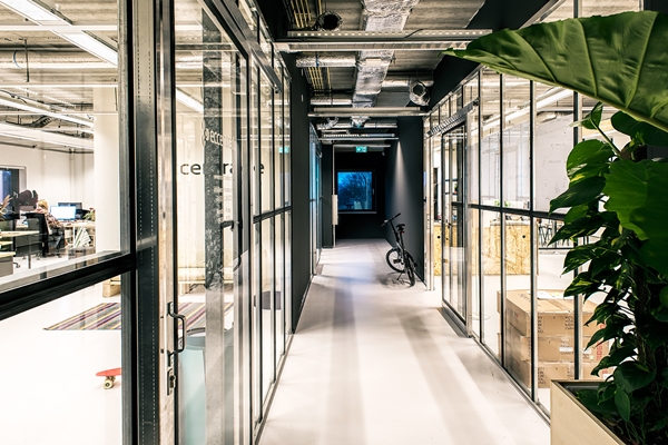 Ook op de kantoorverdiepingen is deze benadering doorgezet. In plaats van traditionele scheidingswanden is daar met een systeem uit de kassenbouw gewerkt, inclusief de schuifdeuren die daarbij horen.