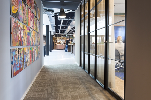 De gemeenschappelijke ruimtes in het kantoor voor Macaw heeft D/Dock fors uitgebreid en voorzien van een mix van verschillende zitplekken: van staand en zittend op krukken, tot gezellig in booths, tot achterover leunend op banken. Om tot een goede akoestiek te komen, heeft D/Dock de gemeenschappelijke ruimtes via glazen wanden en allerlei andere afscheidingen in kleinere compartimenten opgedeeld, zonder daarbij de openheid teniet te doen. Overal zijn ook kleine planten te zien.