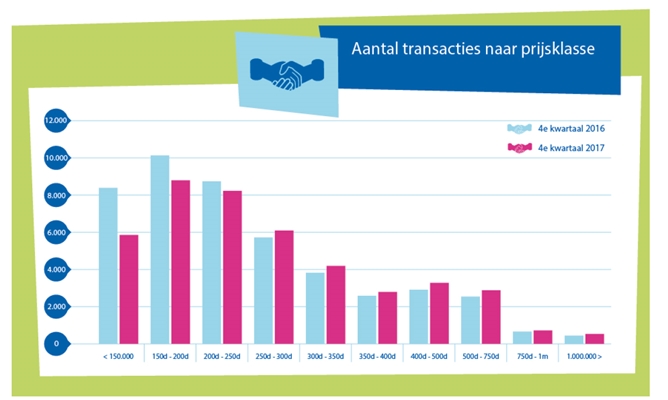 In het vierde kwartaal van het afgelopen jaar werden dertig procent minder woningen tot 150.000 euro verkocht. In de prijsklasse daarboven tot twee ton was de daling dertien procent. Duurdere woningen van 400.000 tot 750.000 euro werden daarentegen dertien procent vaker verkocht.