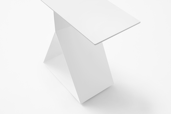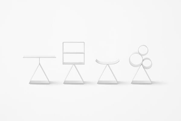 Dit idee heeft Nendo gebruikt voor de meubelcollectie Picto om de verschillende objecten tot een eenheid te maken. Een driehoekige basis dient als de kern; met het oog op zijn functie is bij elk meubel een vorm aan de ‘radicaal’ toegevoegd.