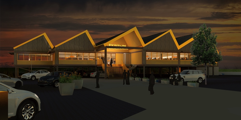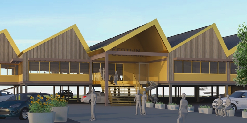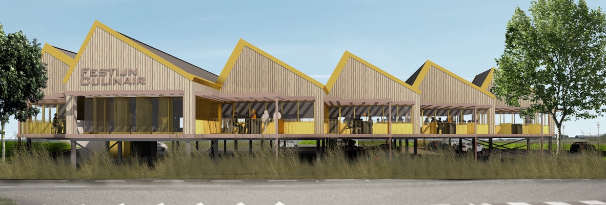 Dit jaar start langs de afrit van de A6 tussen Almere Stad en Buiten de bouw van Festijn Culinair. In dit restaurant op palen kunnen de gasten hun maaltijd kiezen in een van de open keukens. Trapsgewijze daken en gevels bieden binnen en buiten ruimtelijke variatie, meldt