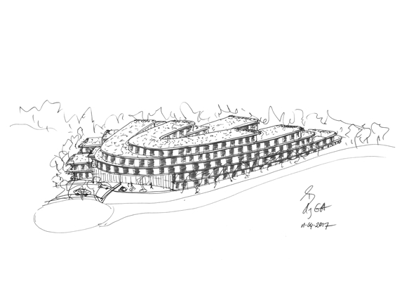 Het gebouw vormt een halve ellips, met tussen de twee buitenste vleugels een derde gebouwdeel. Met een kruisend gebouwdeel ontstaan open en gesloten binnentuinen. Doordat de gebouwdelen alle licht gebogen zijn, loopt geen enkele gang recht en is elke kamer net even anders; de vloeiende gevel verzacht de uitstraling van het gebouw.