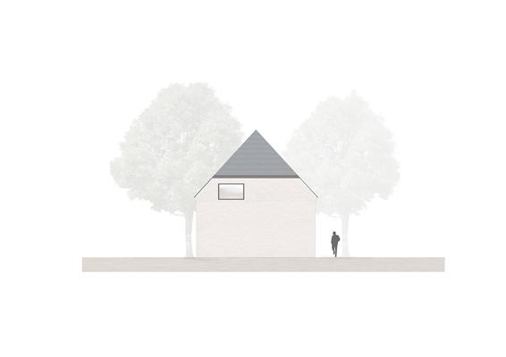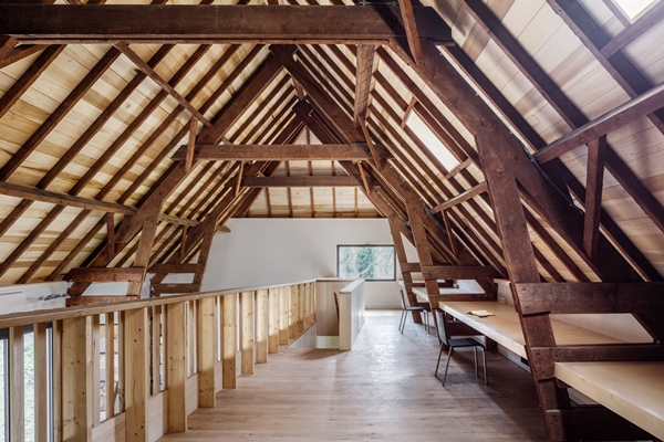 De zonescheiding was mogelijk door in de langsrichting van de schuur een houten volume te plaatsen. Het volume deelt met een schuine lijn de plattegrond in tweeën. Met de schuine lijn ontstaat een verrassend ruimtelijk perspectief die het zicht en de ervaring van de hoge schuur intuïtief stuurt.
