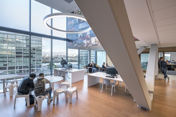Het gebouw heeft een heldere structuur. De onderwijsruimten liggen in twee flexibele zones aan de oost- en westgevel. Hiertussen ligt de ruimtelijke centrale zone met roltrappen, vides, pleinen, thuisbases voor sectoren en open computerwerkplekken.