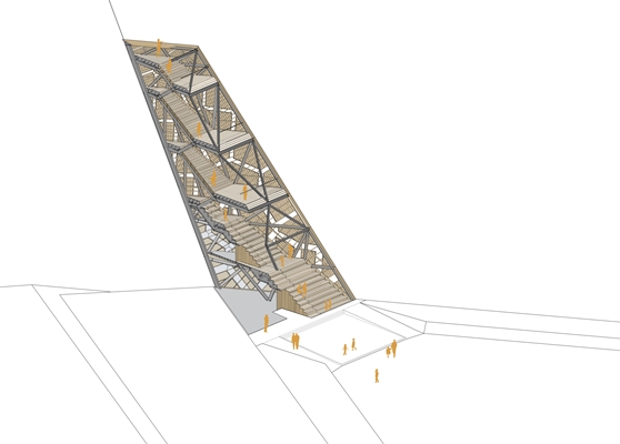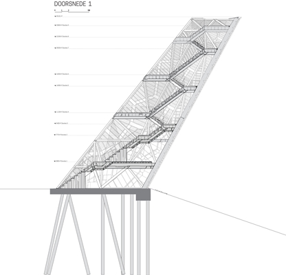 De hoofdconstructie bestaat uit gegalvaniseerd staal; de subconstructie, gevelelementen, trappen en bordessen zijn uitgevoerd in Accoya-hout. De informatieruimte is geïsoleerd en gerealiseerd in houtskeletbouw.