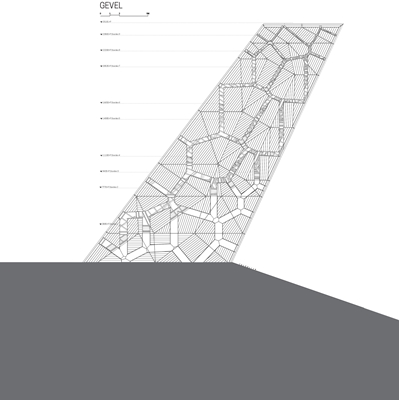 De gevel is vormgegeven volgens het principe van het Voronoi-diagram; een wiskundig principe voor het opdelen van een metrische ruimte. Ro&Ad heeft de driehoeken van de staalconstructie gebruikt om de gevel op te delen in prefabriceerbare elementen en om een extra laag aan de gevel toe te voegen die de dominantie van de driehoeken doorbreekt.