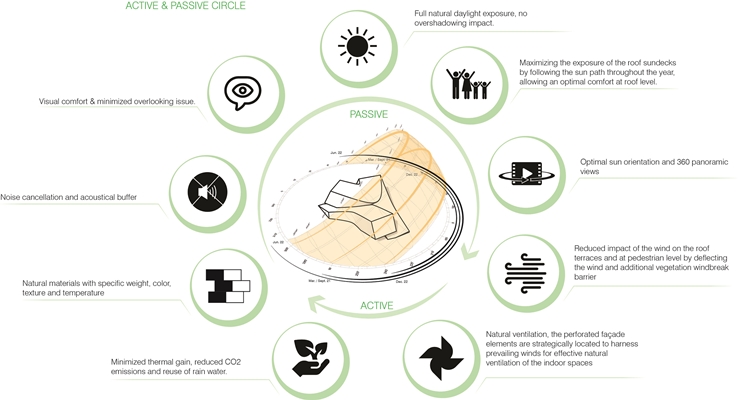 Het complex krijgt gevels van cortenstaal, mede vanwege de ‘natuurlijke’ uitstraling van dit materiaal. In de gevels zijn uitstulpingen en perforaties aangebracht, die in samenspel met de wind bijdragen aan een natuurlijke ventilatie van het gebouw. Ook de isolerende begroeiing op het dak en hergebruik van regenwater behoren tot de duurzame maatregelen.