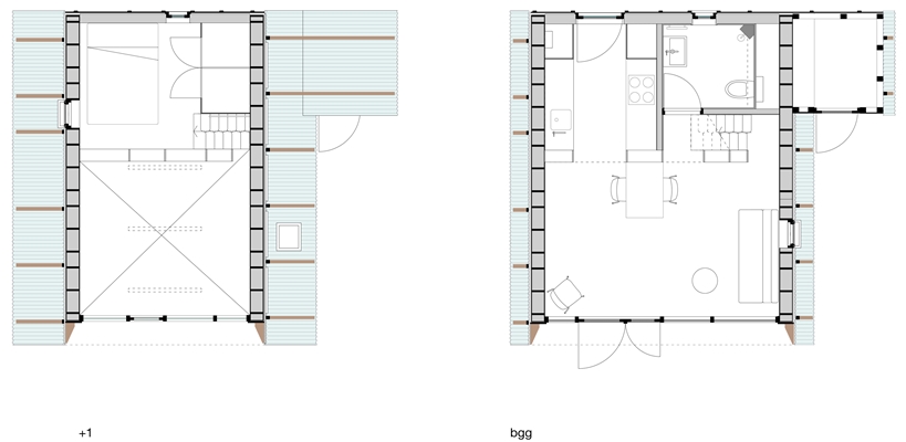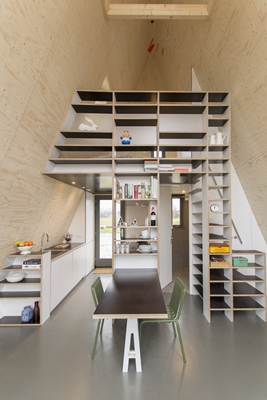 Een groot meubel organiseert het interieur. Het meubel combineert keuken, sanitaire ruimte, trap en de kastenwand die tevens als ruimtescheiding dient. Boven de keuken en badkamer is een ruimte gesitueerd, waar je kunt slapen of werken. De ruimte is min of meer afgeschermd door de kastwand.