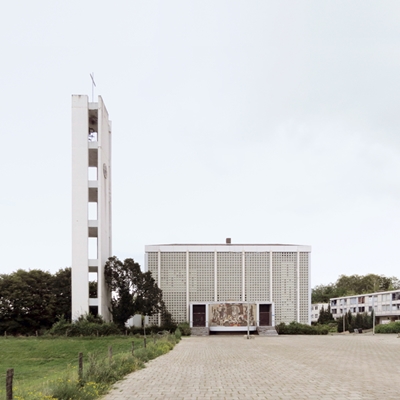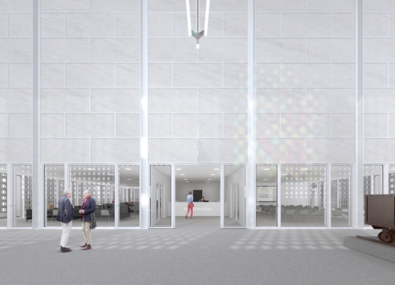 Het nieuwe volume bestaat uit een witte gevelconstructie en volgt het vierkantraster van de kerk. Op die manier worden oud en nieuw letterlijk op dezelfde as gezet, meldt het architectenbureau. Aan de entreezijde wordt een zone vrij gehouden waardoor een royale ontvangsthal ontstaat en bezoekers het ‘hemelse licht’ van de kerk in volle hoogte kunnen blijven aanschouwen.
