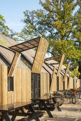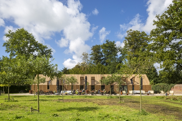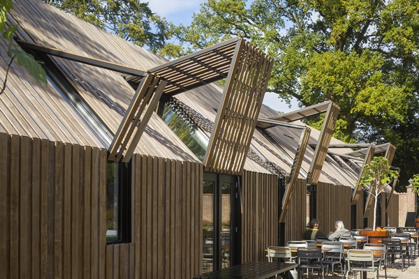 Hof van Duivenvoorde biedt ruimte aan een restaurant, een museumwinkel en de gidsen die bezoekers rondleiden over het landgoed. De opdrachtgever wilde een paviljoen dat eruit zou zien als een schuur, maar tegelijkertijd transparant en uitnodigend is.