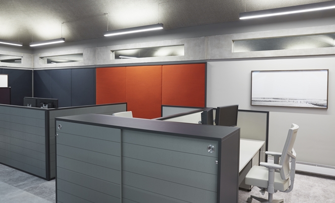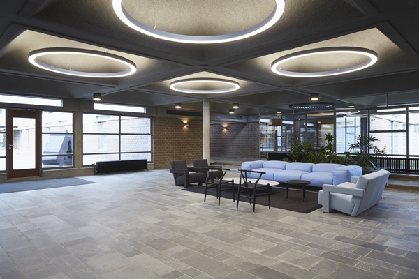 Ze sluiten aan bij de op de zichtbare betonconstructie, maar dragen ook bij aan een goede akoestiek in de paviljoens, waar Ex Interiors de werk- en vergaderplekken heeft ondergebracht. De binnenstraat is ingericht als ontmoetingsplek voor de medewerkers.